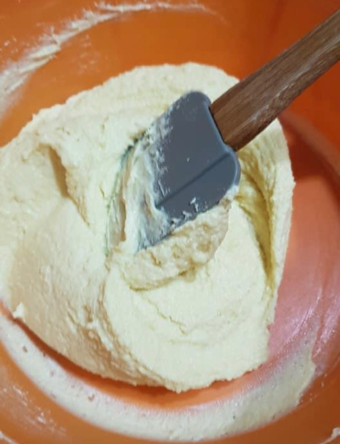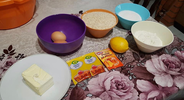 Прашокот за печиво помешајте го со брашното. Изматете го омекнатиот путер на собна температура заедно со шеќерот, па додадете ги јајцата, ванилата и лимоновиот сок. Изматете.