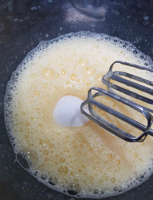 Во подлабок сад пенасто се матат 5 јајца, па постепено им се додава шеќерот и се мати додека да згуснат, побелат и шеќерот да се растопи. Потоа додека сè уште матите додадете млеко и масло, намалете ја брзината, па додадете го брашното, гризот и прашокот за печиво.
