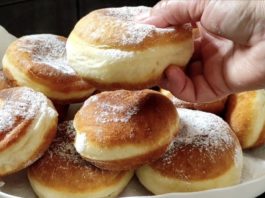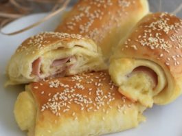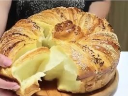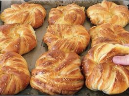 1.Во топлото млеко растворете ги шеќерот и квасецот. Додајте масло, брашно и сол. Замесете доста меко тесто кое сосем малку се лепи за рака. Истресете го на малку набрашнета површина и домесете го за да не се лепи.