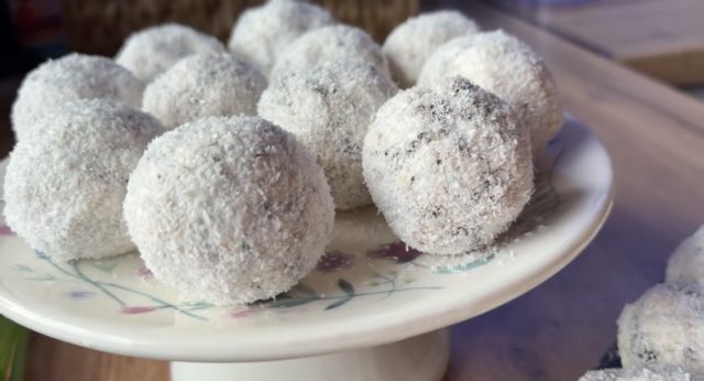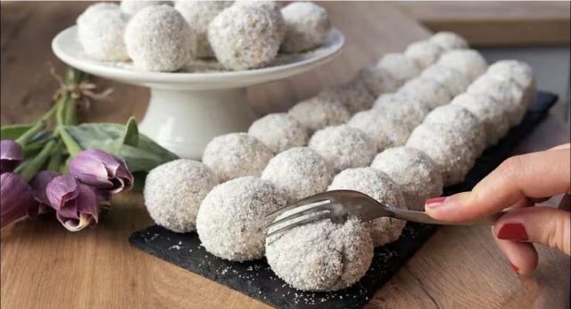 6. Секое топче валкајте го во кокос и наредете го на послужавник.