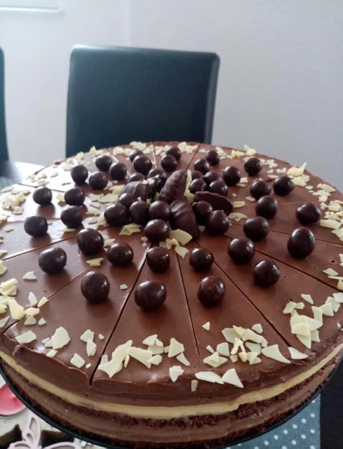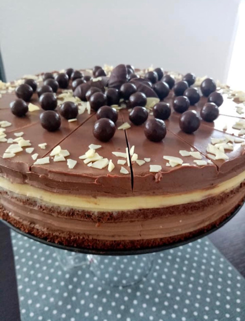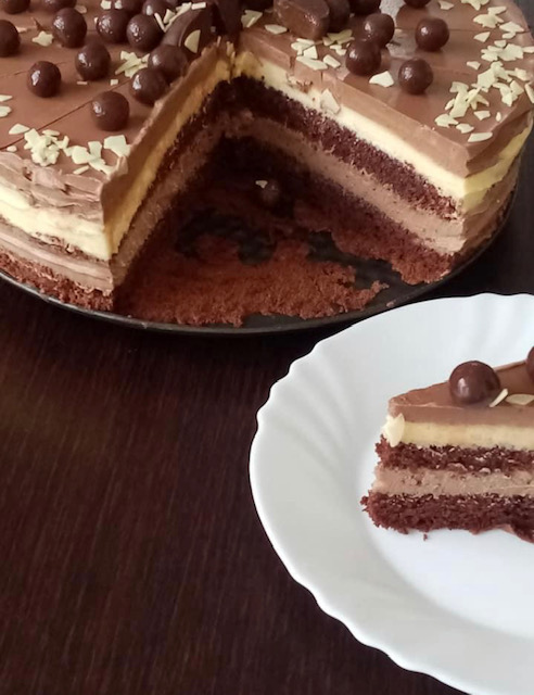 Јас ја правев по следниов редослед: кора – темен фил – кора – бел фил и одозгора 500 мл слатка павлака со 200 г чоколадо за готвење.
