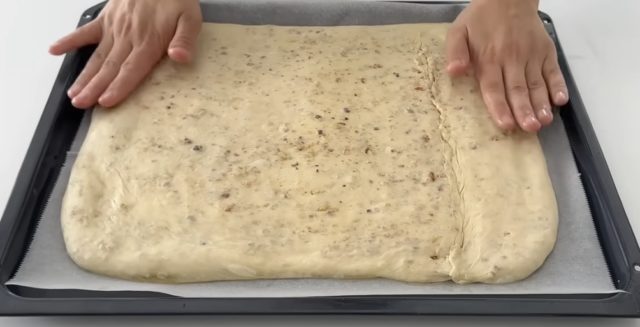 14. Нежно притиснете ја со дланките за да се распореди рамномерно до големина на плехот.