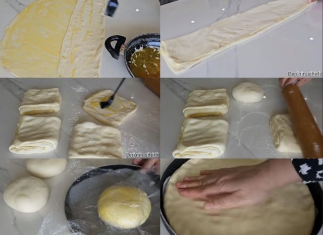 7. Лесно сплескајте го квадратот со оклагија, премачкајте со путер и соберете ги краевите навнатре, формирајќи топка.