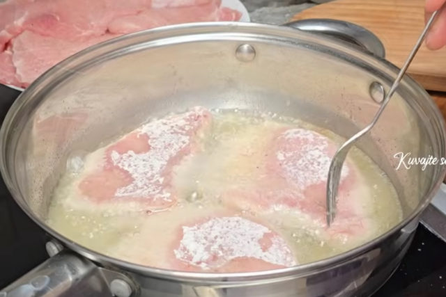1. Шницлите од свинското каре истенчете ги со кујнски чекан, па зачинете ги со сол и црн пипер. Секоја шницла извалкајте ја во брашно, осигурувајќи се дека е рамномерно обложена од двете страни.