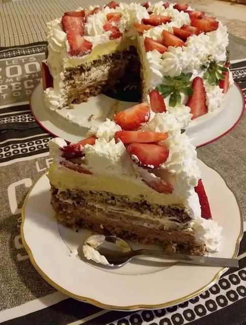 Рецептот за оваа прекрасна и декоративна торта ни го претстави нашата драга членка Александра Шуманова во групата НМД рецепти. Тортата се прави со кори од белки и ореви, а се филува со крем од жолчки и пудинг од ванила. Многу вкусна и свечена торта.