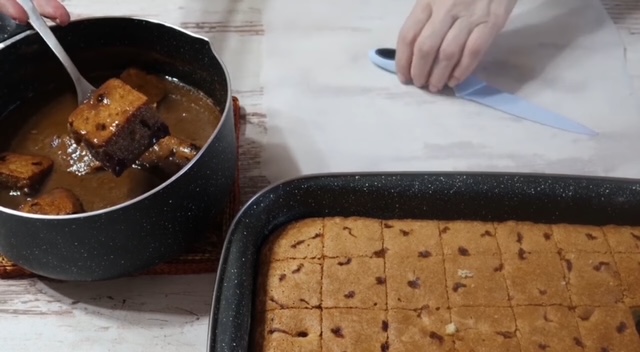 5. Оладениот бисквит исечете го на коцки (треба да добиете околу 45 парчиња). Секоја коцка потопете ја во чоколадниот прелив, внимавајќи да биде рамномерно премачкана од сите страни. Извадете ги коцките врз хартија за печење.
