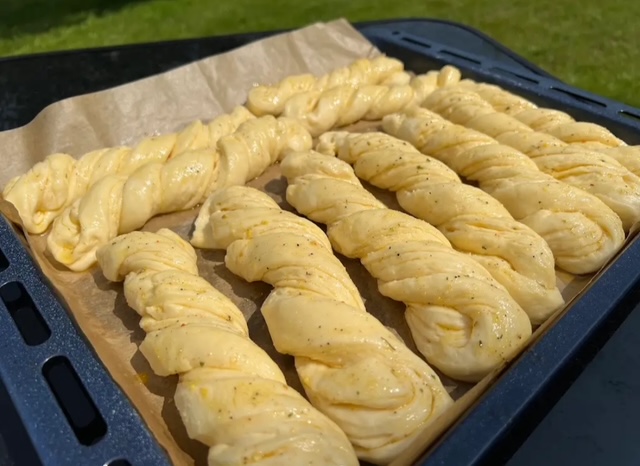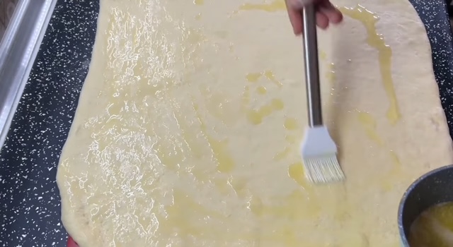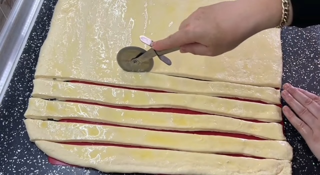 5. По одморот, повторно развлечете го тестото во правоаголна или квадратна форма. Намачкајте го со растопен путер и исечете го на ленти со ширина од 2–2,5 см. Секоја лента преклопете ја на половина и спирално свиткајте ја во форма на ролничка.