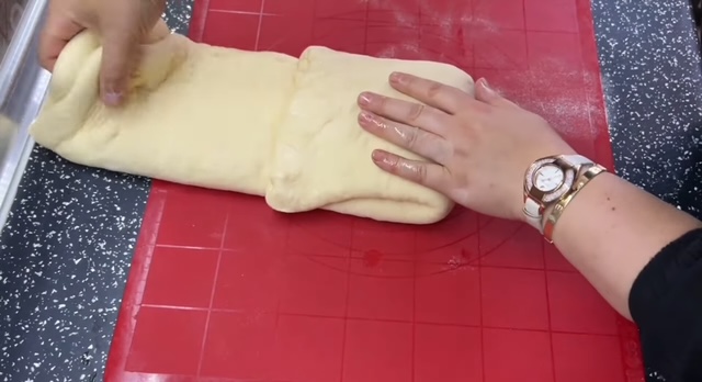 3. По ферментацијата, истресете го тестото на лесно набрашнета работна површина и нежно премесете го за да се ослободи воздухот. Обликувајте го во топка, а потоа со оклагија развлечете го во правоаголна кора.