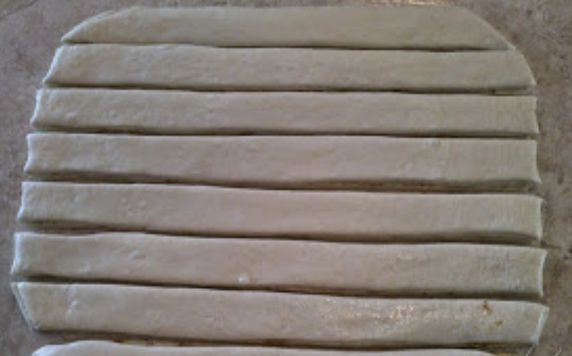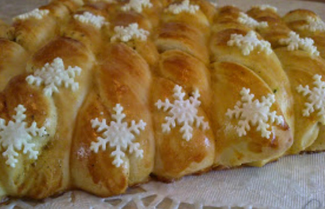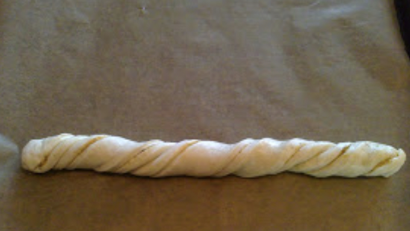 Го сечеме тестото на ленти широки 5 см. Секоја лента ја виткаме спирално и ја редиме во плех обложен со хартија. Лентите ги редиме по големина, во вид на елка. Започнувајќи од најдолгата која ќе биде основата или започнувајќи од самиот врв, постепено градете ја елката од тесто.