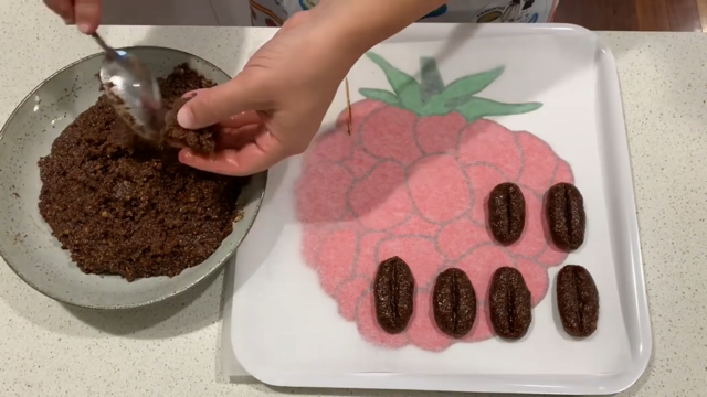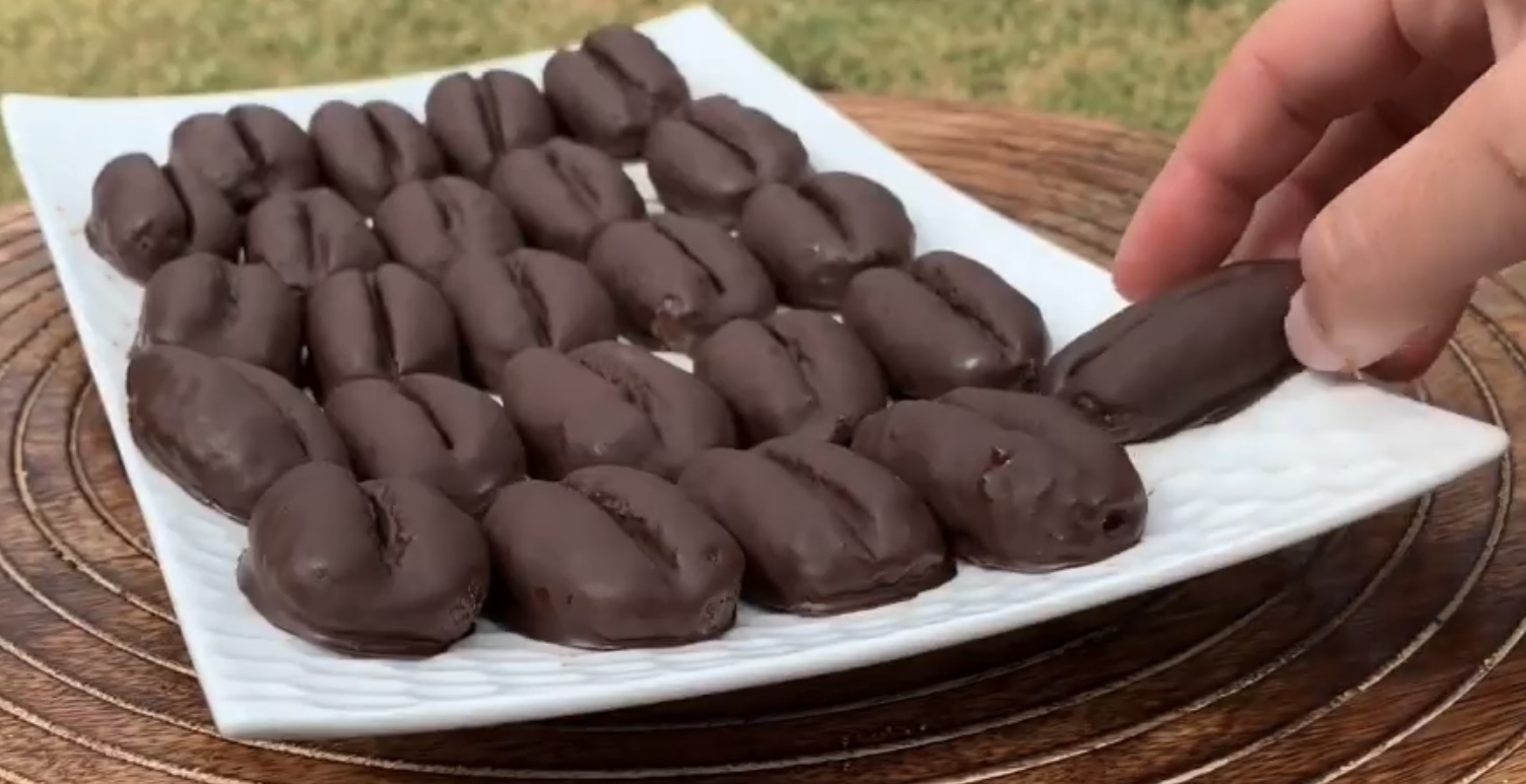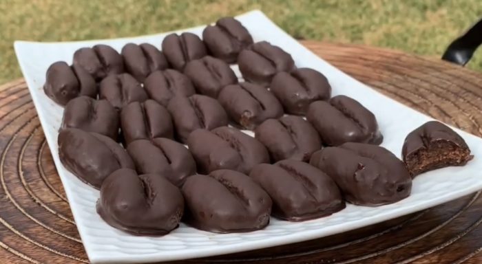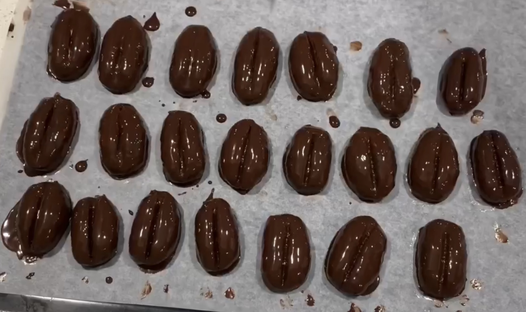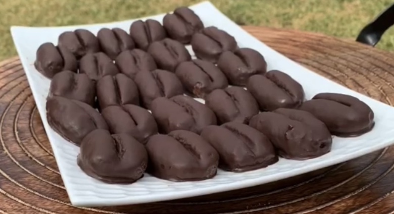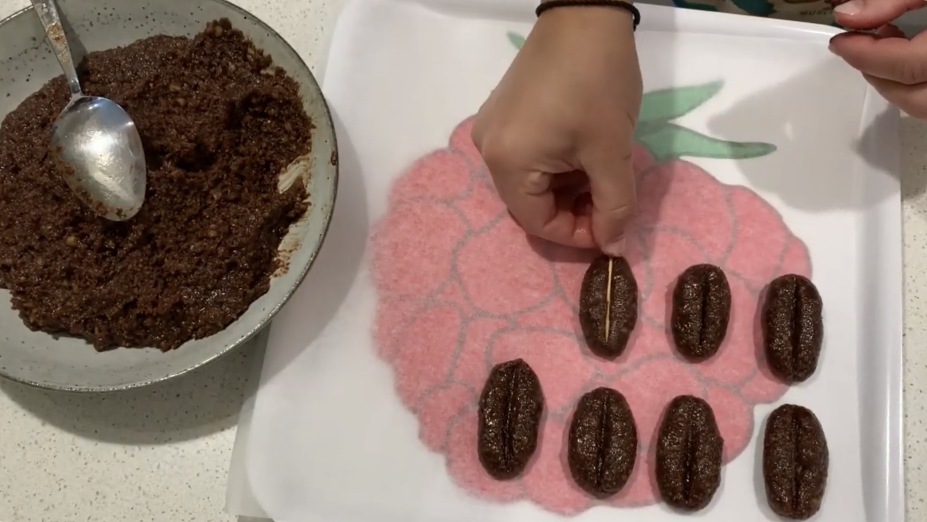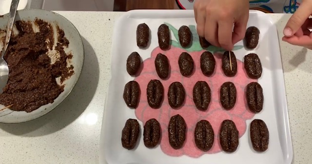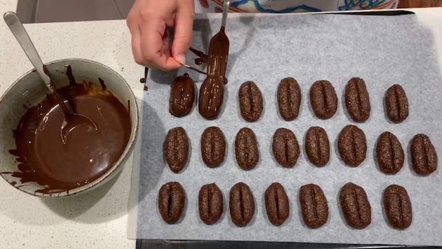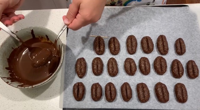 Потоа земајте од смесата и формирате валјаци, а со чепкалка за заби втиснувајте линија на средината за да добиете облик на кафе. Колачите редете ги во плех обложен во хартија, а потоа ставете ги во фрижидер да изладат околу еден час и добро да се стегнат.