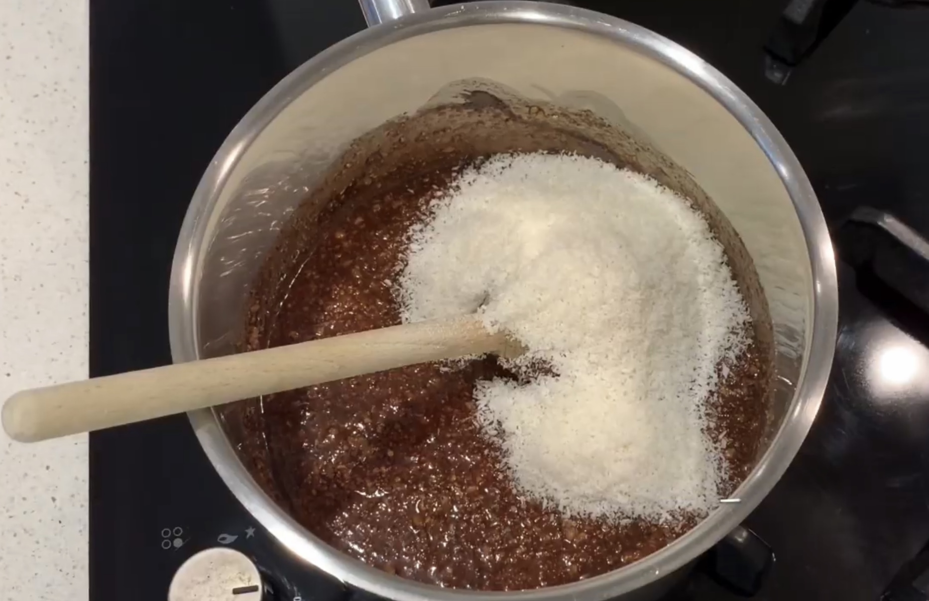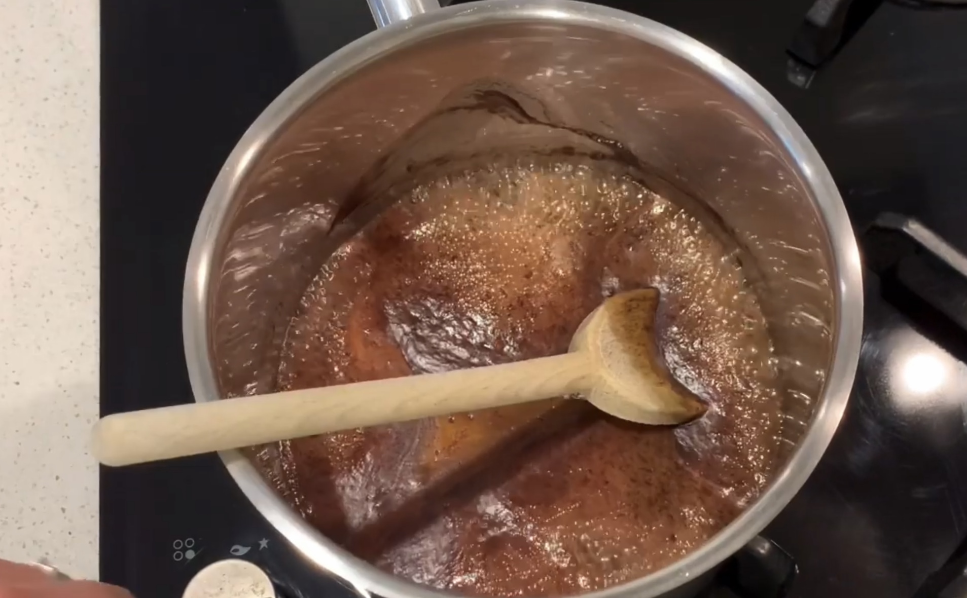 Во едно тенџере ставете 100 мл вода, 1 ванилин шеќер, 250 г шеќер, 150 г посен маргарин, 80 г посно чоколадо искршено на коцки. Ставете на тивок оган да се загрева додека да се растопат состојките и да се соединат.