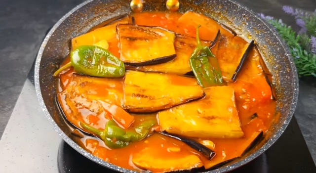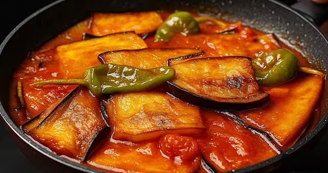 Сочните пржени патлиџани се спојуваат со пикантен сос од домати и лук, создавајќи незаборавно гастрономско искуство.