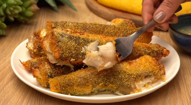 4. Натопете ја рибата во смесата од брашно и зачини, осигурувајќи се дека е рамномерно обложена од сите страни.