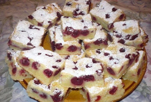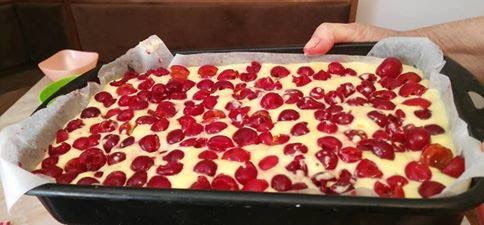 Наведените состојки добро измешајте ги, истурете во намастена и побрашнета тепсија, одозгора наредете ги вешните, па печете на 200 степени додека да зарумени (проверете со чепкалка).