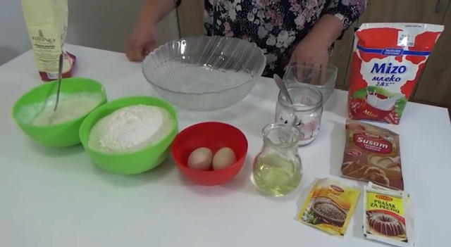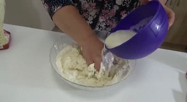 Направете вдлабнување во брашното па додадете го крем сирењето. Посебно пенасто изматете ги белките со виљушка, додадете по 100 мл млеко и масло, па оваа мешавина додадете ја во брашното и замесете го тестото.