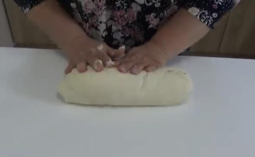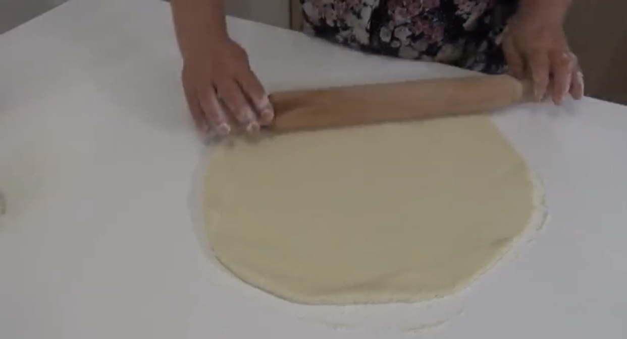 Тестото треба да биде меко, но не премногу. Ако ви се чини дека е многу меко, тогаш додадете уште малку брашно . Жолчките оставете ги за премачкување. Замесеното тесто префрлете го на работна површина и уште малку домесете го, па поделете го во две топки. Веднаш развлечете кори со помош на оглагија. Кругот поделете го на 16 триаголници.