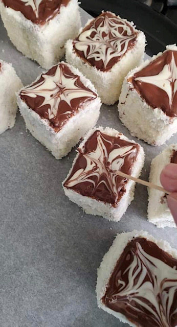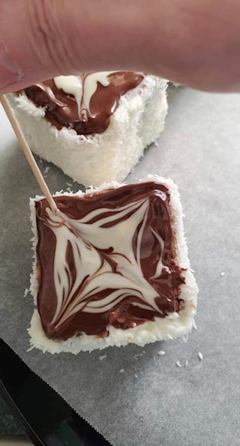 Кога ќе се излади кората, според оригиналниот рецепт треба да се вадат кругови со чаша или тркалезна модла, но јас одлучив да ги сечан на квадрати. Потоа секое парче се пресекува на половина. Се филува и се лепи, а потоа се премачкува и од страните и се валка во кокос.