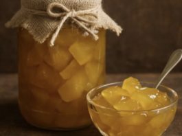 Потоа додека сè уште е топло ги полнам теглите, ги враќам во рерна и ги потпекувам малку, колку да се фати коричка. Теглите ги редам во соодветна вангличка, ги покривам со ќебе и ги оставам така затоплени додека џемот целосно да се олади и потоа ги редам во шпајз.
