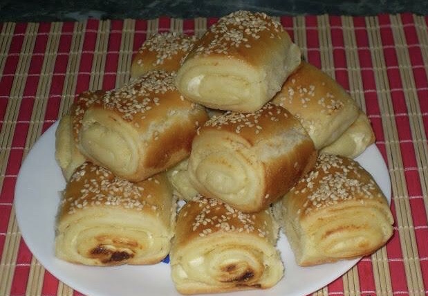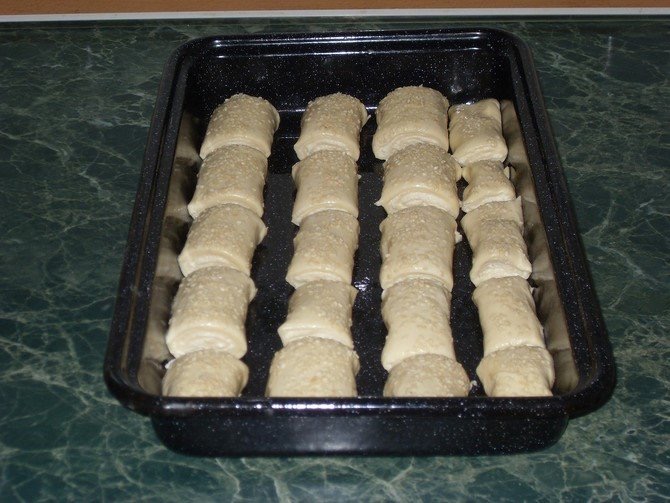 Ролатите сечете ги на помали штрудлички. Премачкајте ги со матената жолчка и наросете со сусам.