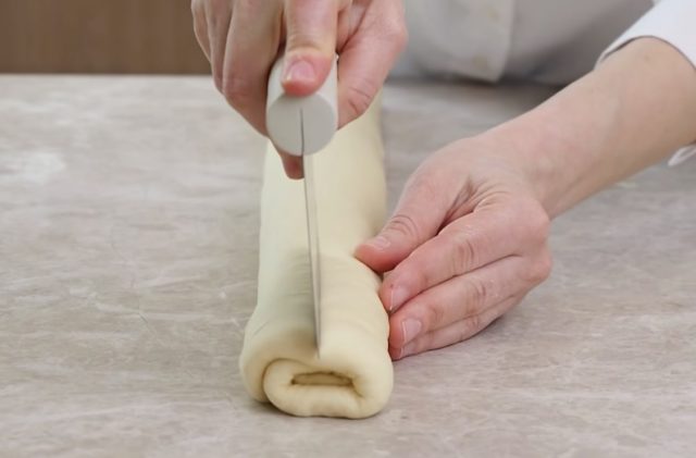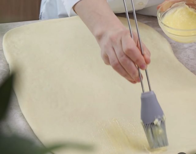 Нараснатото тесто развлечете го во правоаголна форма. Премачкајте го со путерот, па внимателно завиткајте ролат по должина.