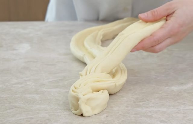 Ролатот поделете го на два еднакви дела и исплетете плетенка.