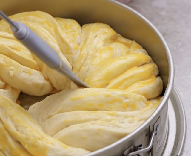 Плетенката префрлете ја во намастен кружен калап (околу 24 см). Оставете ја да нарасне уште 30 минути, додека да стане видливо помека и повисока.