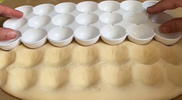 6. Нанесување на билниот путер: Со прстите или со лажичка или со задниот дел на пластичен калап за коцки мраз, направете мали вдлабнатини на површината на нараснатото тесто.