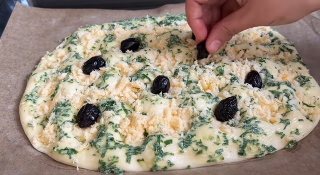 Намачкајте ја смесата со билен путер рамномерно преку целата погача, а вдлабнатините пополнете ги со рендан кашкавал и маслинки.