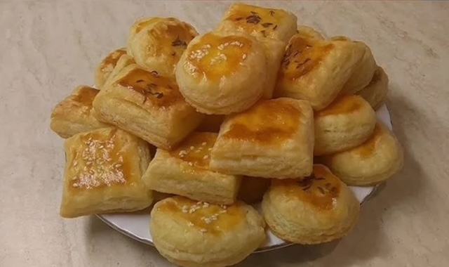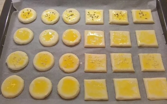 Исечере во коцки или облици по ваша желба и наредете ги во плех (40×30 см) обложен со хартија за печење. Одозгора премачкјате ги со жолчка и посипете ги со семе по желба.