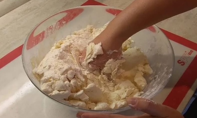 Во длабок сад измешајте сирење, брашно, путер, сол и прашок за печиво. Добро измесете ги состојките со рацете за да добиете мазно, еднолично тесто.
