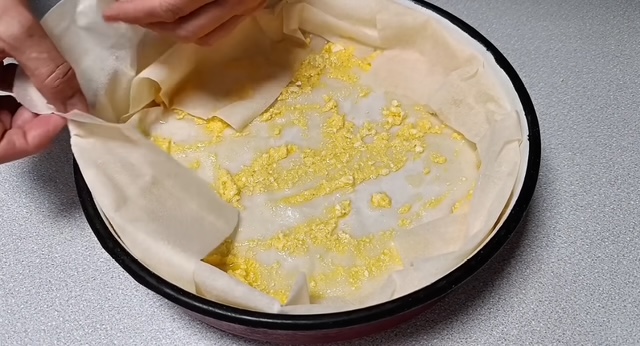 2. Намастете тава со дијаметар од 30 см со малку масло. На дното поставете две кори така што нивните краеви да излегуваат надвор од тавата.
