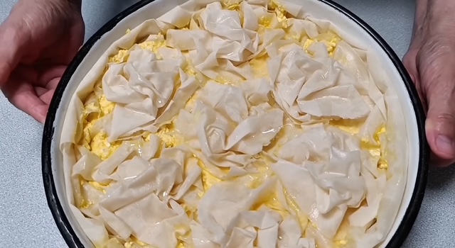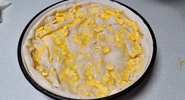 4. Во средината поставете две изгужвани кори и премачкајте ги со 3 лажици масло. Врз нив распоредете уште една четвртина од филот.