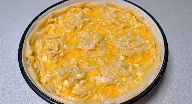 8. Во посебен сад изматете ги преостанатите 3 јајца, додајте малку сол, 150 мл млеко и 50 г ситно издробено сирење. Измешајте добро и рамномерно прелијте ја смесата врз гибаницата.