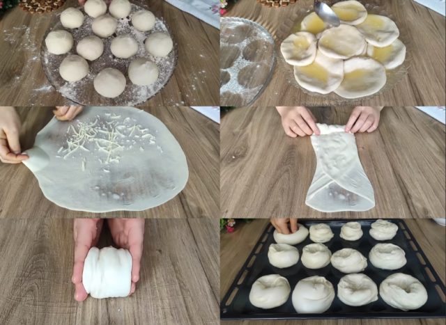9. Во средината посипете кашкавал, преклопете ги краевите, свиткајте во ролничка, притиснете ја со дланките на двата краја за да се оформи топче.