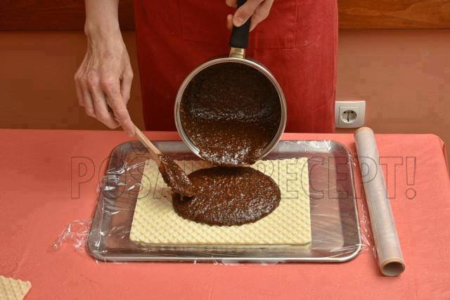 1.Во шерпа ставете вода и шеќер, па гответе додека да зоврие. Потоа додадете маргарин исечкан на коцки и искршено чоколадо, па мешајте додека да се растопи.