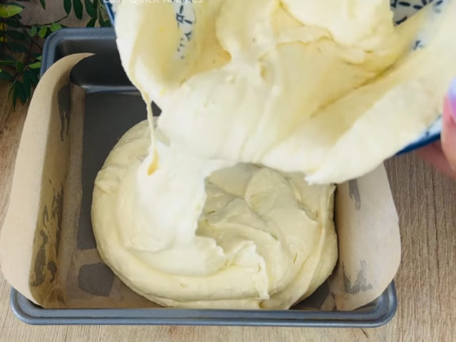 4. Печење: Префрлете ја смесата во подготвената тава и израмнете ја површината.