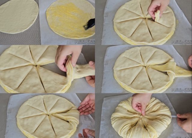 6. Откако ќе нарасне, нежно притиснете го тестото за да го ослободите вишокот воздух и поделете го на 6 еднакви делови.