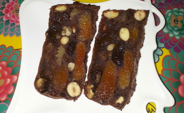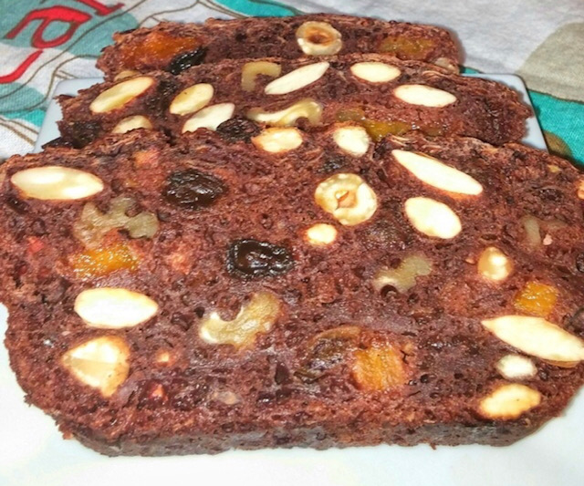 Постапка: Во еден поголем сад ставете сливи, кајсии, ореви, лешници и суво грозје претходно натопени во рум. Не треба ништо да сечете, ставете ги цели плодовите. Потоа изрендајте ги јаболката во смесата и повторно добро промешајте. Додадете брашно помешано со прашок за печиво и какао.