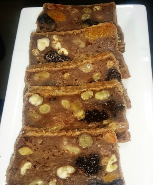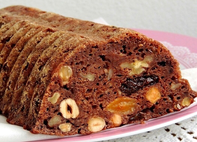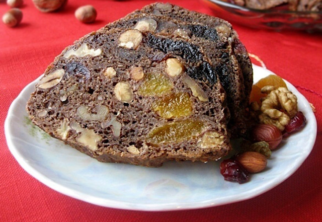 Потребни состојки: 100 г суви сливи, 100 г суви кајсии, 100 г цели ореви, 100 г цели лешници, 1 голема лажица суво грозје натопено во рум, 1 голема лажица какао, 1 мала лажичка цимет, 200 г шеќер, 250 г брашно, 5 големи киселкасти јаболка (не смеат да бидат слатки) и 1 прашок за печиво