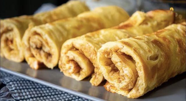6. Откако ќе се испече, исечете ја на ленти, па измешајте 4 лажици шеќер и 1 полна лажичка цимет и посипете одозгора. Свиткајте ги ролничките.