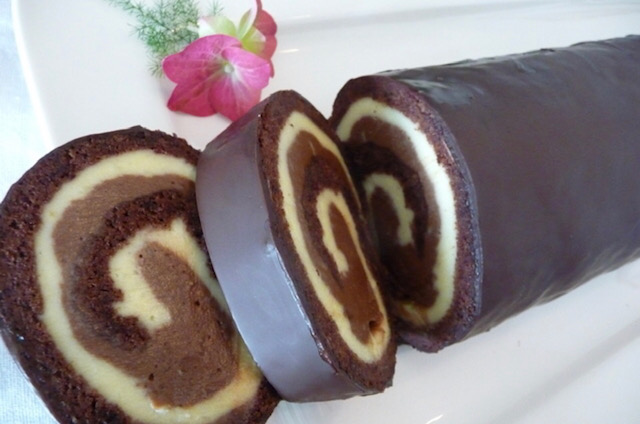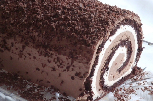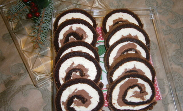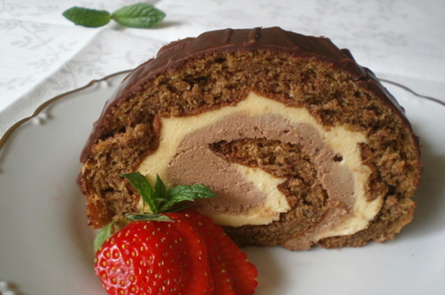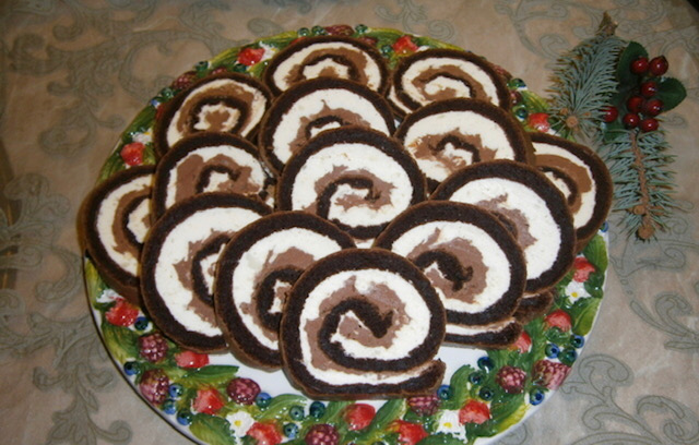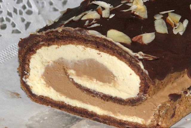 Повторно свиткајте го ролатот и оставете го малку во фрижидер да излади. Можете да го сечете и така да го послужете, а може да го прелиете со чоколадна глазура и да го украсите со листови од бадем.