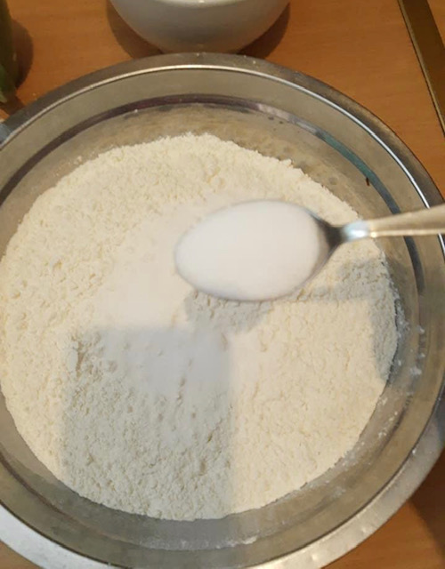 2.Во поголем сад ставете 700 г брашно и две лажички сол, па малку промешајте со лажицата. Додадете го активираниот квасец и уште 350-400 мл млака вода.