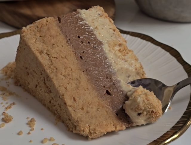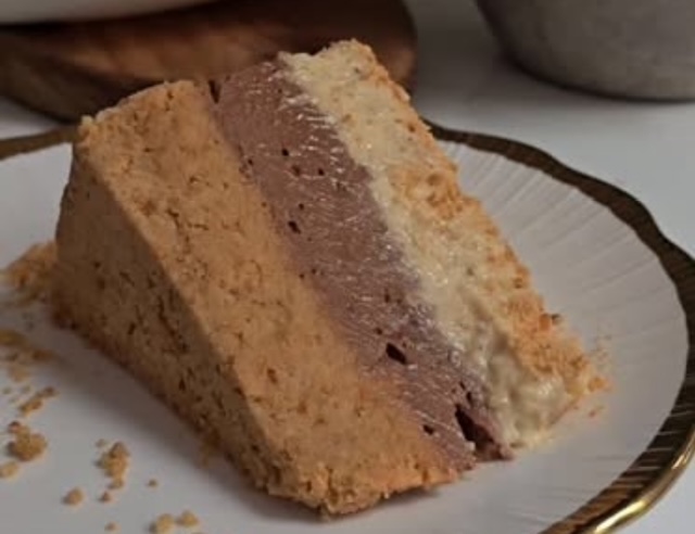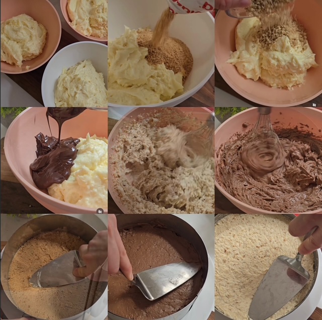 8. Во калап со дијаметар од 22 см, наредете ги слоевите во следниот редослед: прво смесата со мелен бисквит, потоа смесата со чоколадо и на крај смесата со ореви и бисквит.