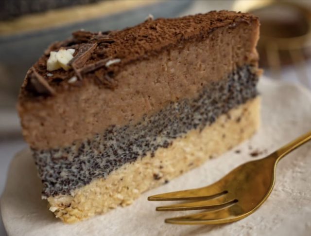 6. Во калап за торта ставете ја смесата со бисквити како прв слој, израмнете, па додајте ја смесата со афион како втор слој. На крај, ставете ја смесата со лешници и чоколаден намаз.