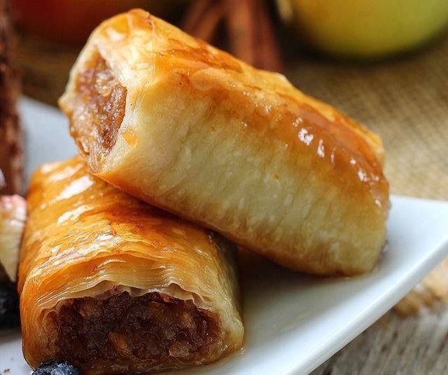По две кори спојувајте, премачкувајте со путер и масло, па додадете фил од јаболко. Филот се нанесува само на едниот дел на почетокот, па се витка. Внимавајте да ви стигне филот за сите кори.
