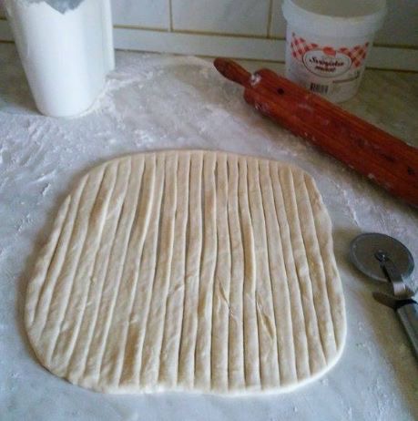 Надојденото тесто поделете го на два нееднакви делови (со мала разлика). Помалиот дел развлечете го во четириаголна кора, премачкајте го со растопената маст/путер и сечете на ленти со ширина од 1-1,5 см ширина, но не до крај. Ивиците на кората мора да бидат споени (види фото).