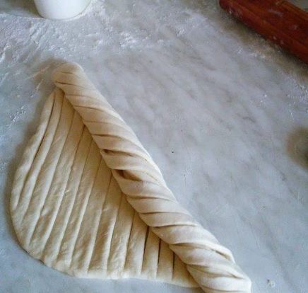 Тестото свиткајте го така што се трга од еден агол кон средината, до спротивниот агол. Вака добиениот „ролат“ се витка во облик на полжав.