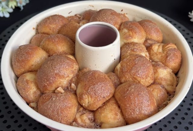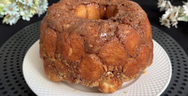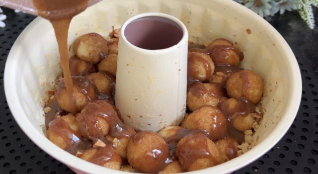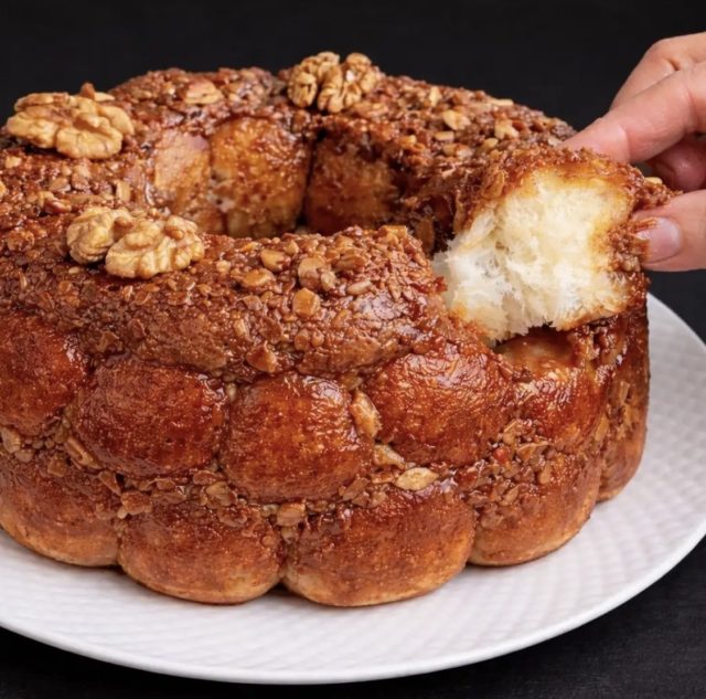 Оставете кратко да се подизлади, па внимателно превртете го врз десертна чинија. Печивото се кине на мали парчиња и е особено вкусно додека е млако. Постапката погледнете ја во видео прилогот ОВДЕ: