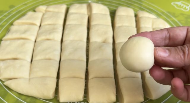 Стасаното тесто истресете го на лесно набрашнета површина, развлечете го во правоаголна кора и исечете го на еднакви коцки. Од секоја коцка обликувајте топче со големина на пинг-понг топче.
