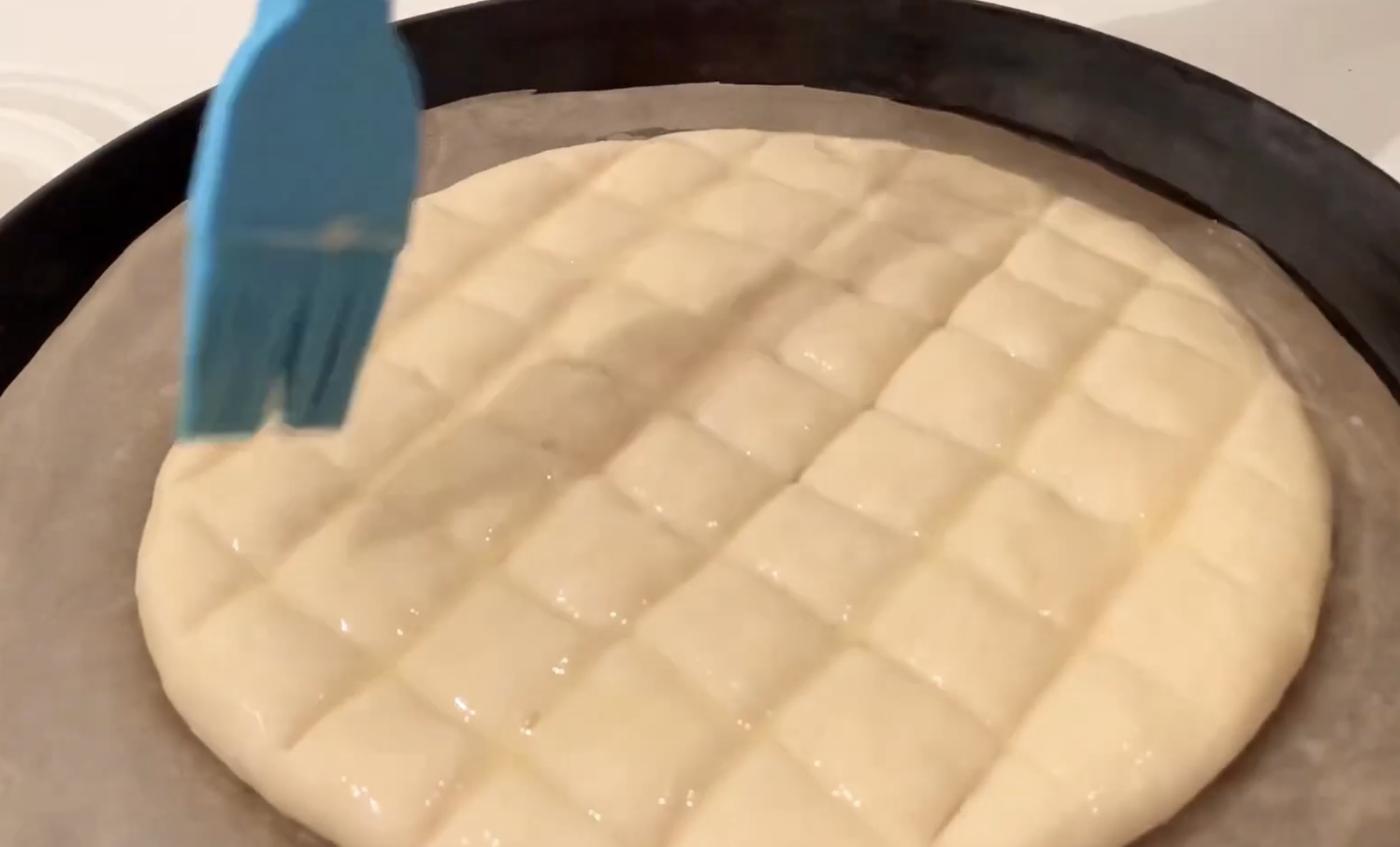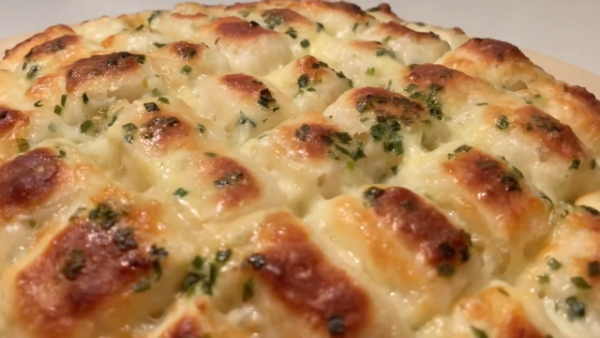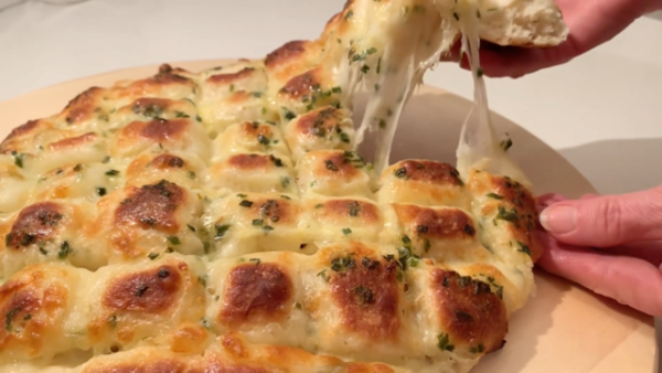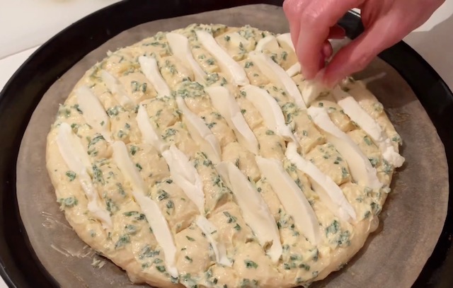 Погачата премачкајте ја со изматено јајце, а потоа премачкајте ја со путер-смесата. Со помош на лажица направете “џепови” во кои ќе ставите исечкана моцарела. Ставете да се пече 20 минути во претходно загреана рерна на 200 степени. Целата постапка можете да ја видите во видеото: